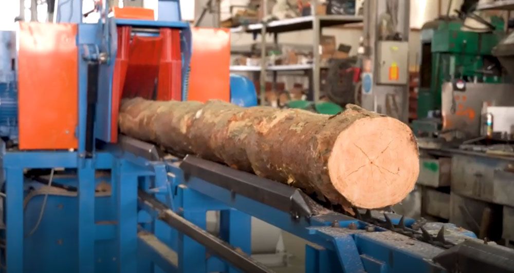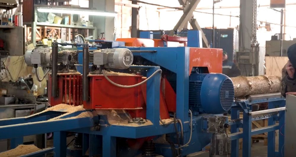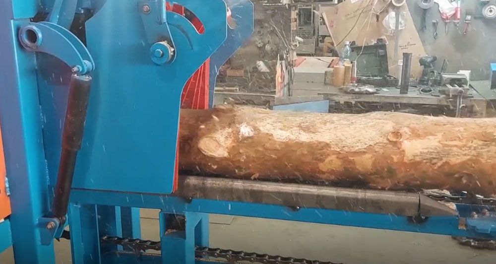 Подача сырья в пильный блок, осуществляется с помощью цепного механизма.