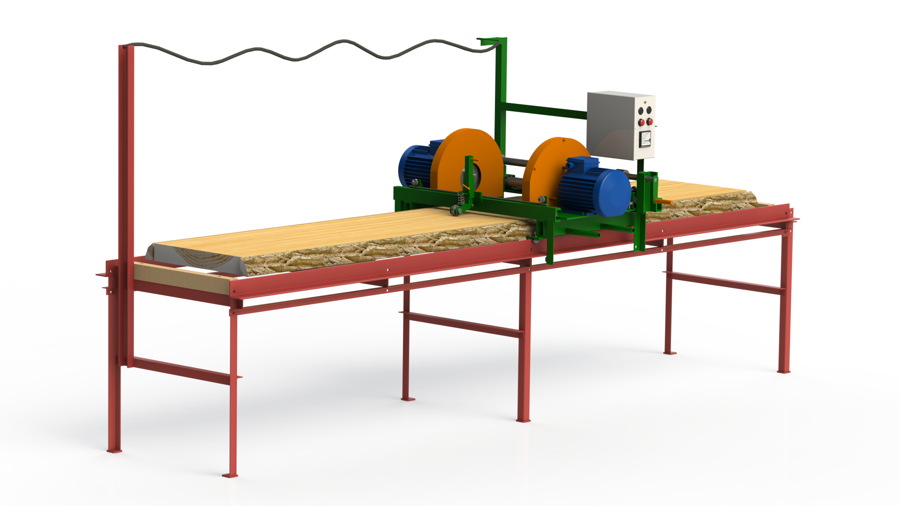 Доска укладывается по центру стола и обрезается сразу с двух сторон при движении пильной каретки как в прямом, так и в обратном направлении. Прижим доски обеспечивается прижимными роликами по центру доски. Дисковые пилы вращаются друг против друга, всегда в одном направлении, вт.ч. при смене направления пильного блока. Перемещение пильного блока осуществляется оператором станка вручную за поручни.
