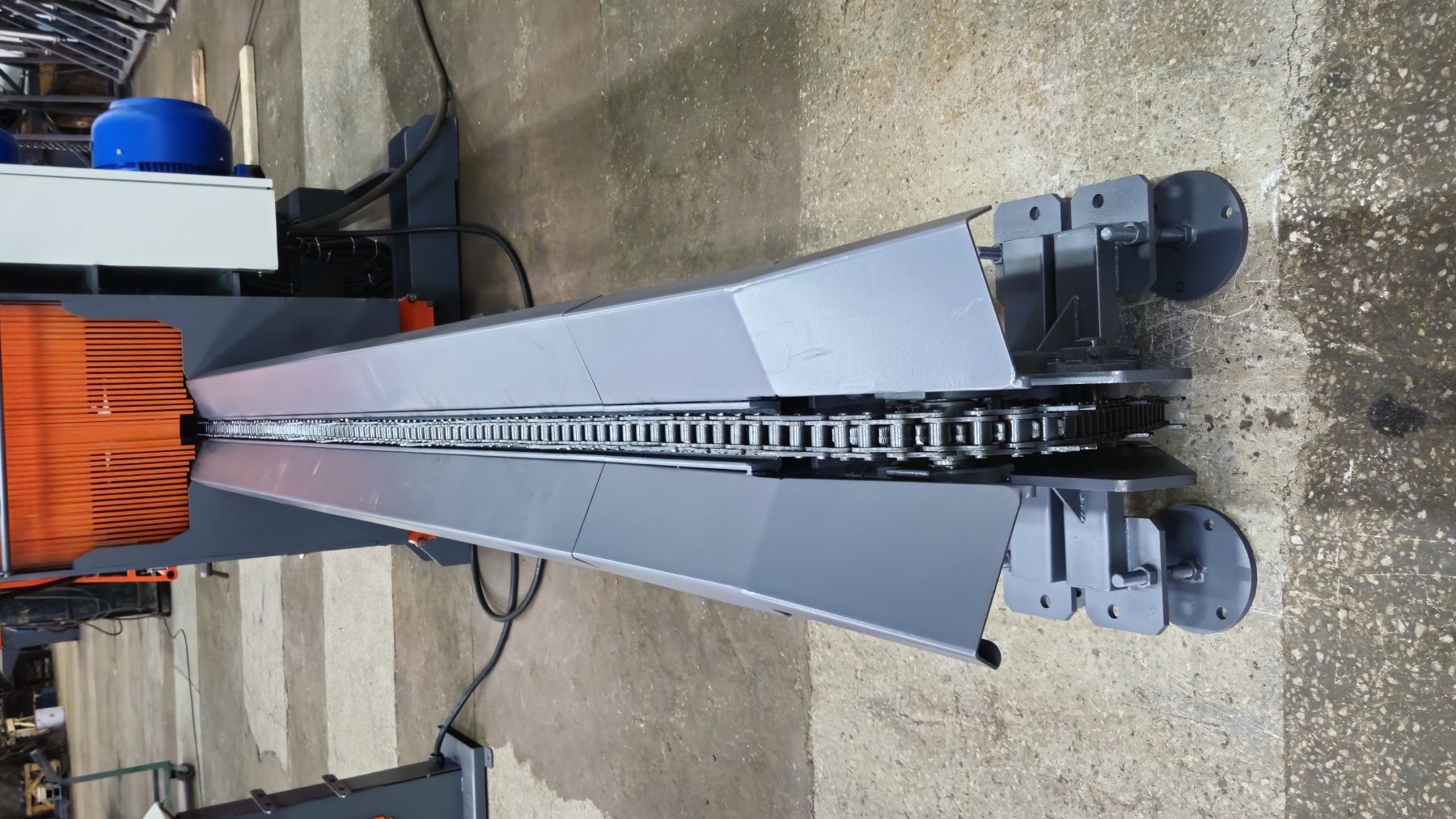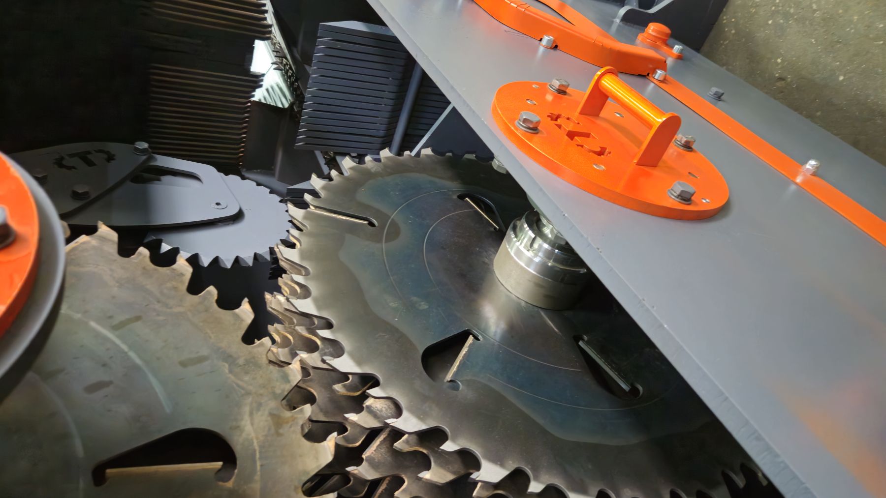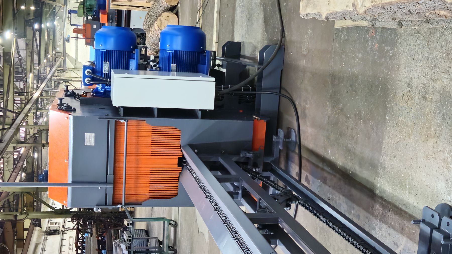 Размер между пилами устанавливается при помощи винтовой пары вручную и фиксируется прижимными гайками. Бревно устанавливается по центру стола и при помощи цепной передачи передвигается в зону пиления. Для регулировки скорости подачи станок оснащен частотным преобразователем позволяющим изменять скорость от 0 до 22 м/мин.