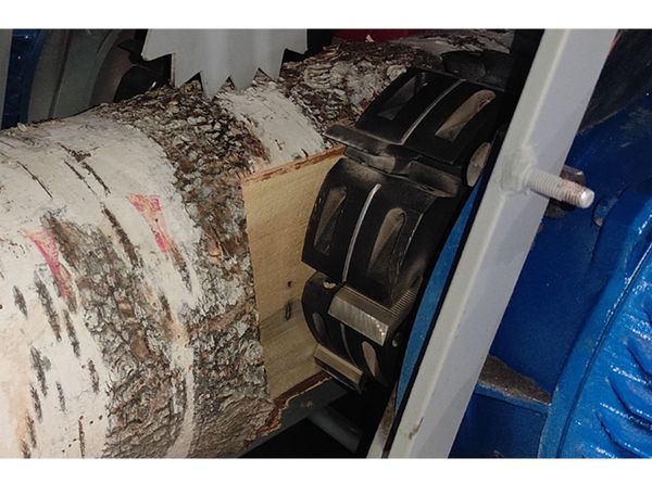 Многопильный блок двухвальный с вертикальным расположением валов. На каждом валу может быть установлено 6-9 пильных дисков в зависимости от толщины лафета. На выходе из блока установлен расклинивающий нож, который отделяет горбыль и обеспечивает принудительную подачу распиленного материала через блок приводных рябух на приемный стол станка В многопильном блоке установлены два электродвигателя мощностью по 30 кВт каждый и пилы диаметром 250 мм, что позволяет распиливать лафет толщиной до 160 мм.