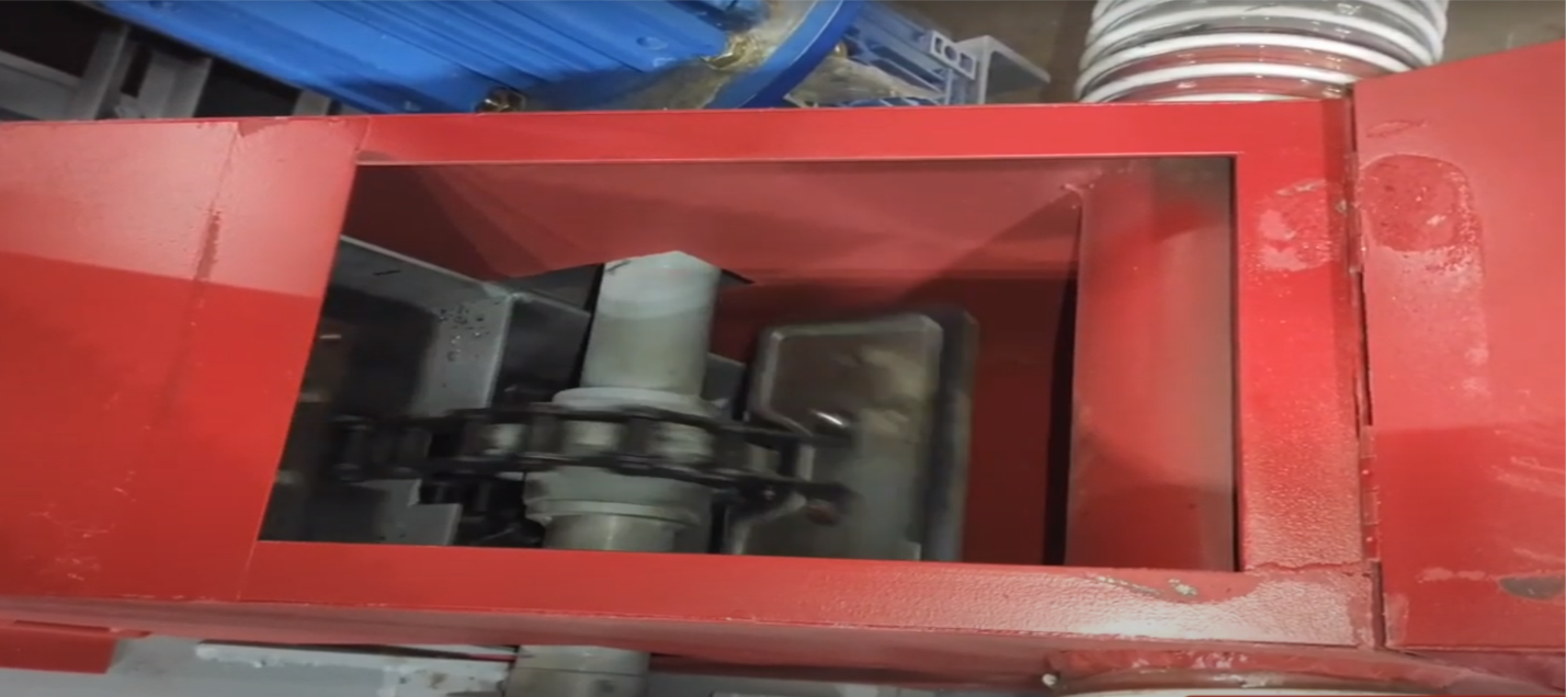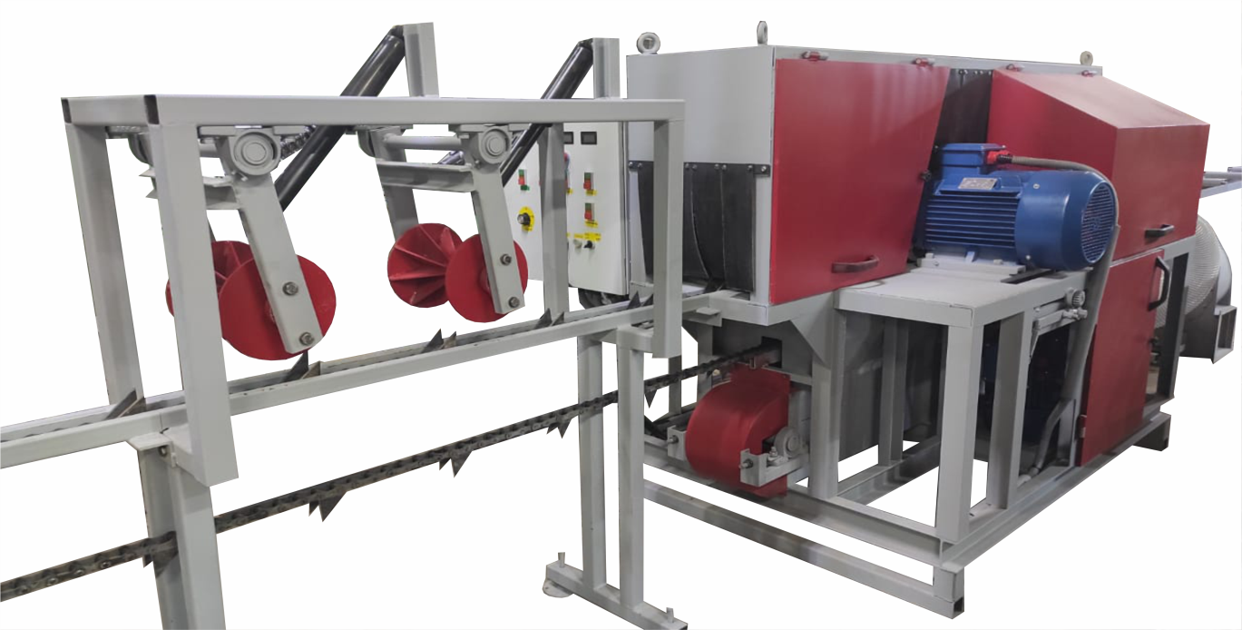Транспортер скребковый цепной, предназначенный для автоматического удаления стружки, щепок и опилок из-под станины фрезерно-брусующего блока и пильного узла. Наличие скребкового транспортера в значительной мере повышает не только производительность станка, а также культуру и удобство. Конструктивно транспортер состоит из специальной транспортерной цепи, перемещающейся по направляющим за счёт мотор-редуктора, натяжение цепи осуществляется натяжным блоком с возможностью регулировки.