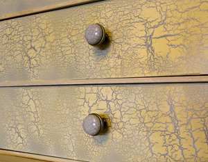 Для получения декоративного результата можно применять специализированные кракелюрные лаки. У них прозрачная структура, они наносятся между двумя контрастными красками. Такой метод позволяет использовать любую цветовую гамму, включая пастельные и насыщенные оттенки. Наилучший визуальный эффект достигается при соблюдении пропорции между слоями: 1:1 по толщине.