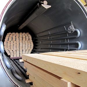 Во время вакуумного сушения пиломатериалы размещают в герметичных камерах, где создается пониженное давление (до 10 КПа), при котором температура кипения воды снижается до 45°С. Это разрешает вести высокоинтенсивный процесс сушения при низких температурах и полном сохранении естественных свойств дерева.