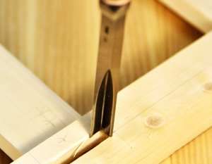 В случае с торцевыми пазами сначала сверлят отверстия по контуру, затем соединяют их стамеской. Диаметр сверла берут на 0,5 мм меньше ширины паза. При обработке криволинейных участков используют узкие желобчатые стамески шириной 3-4 мм.