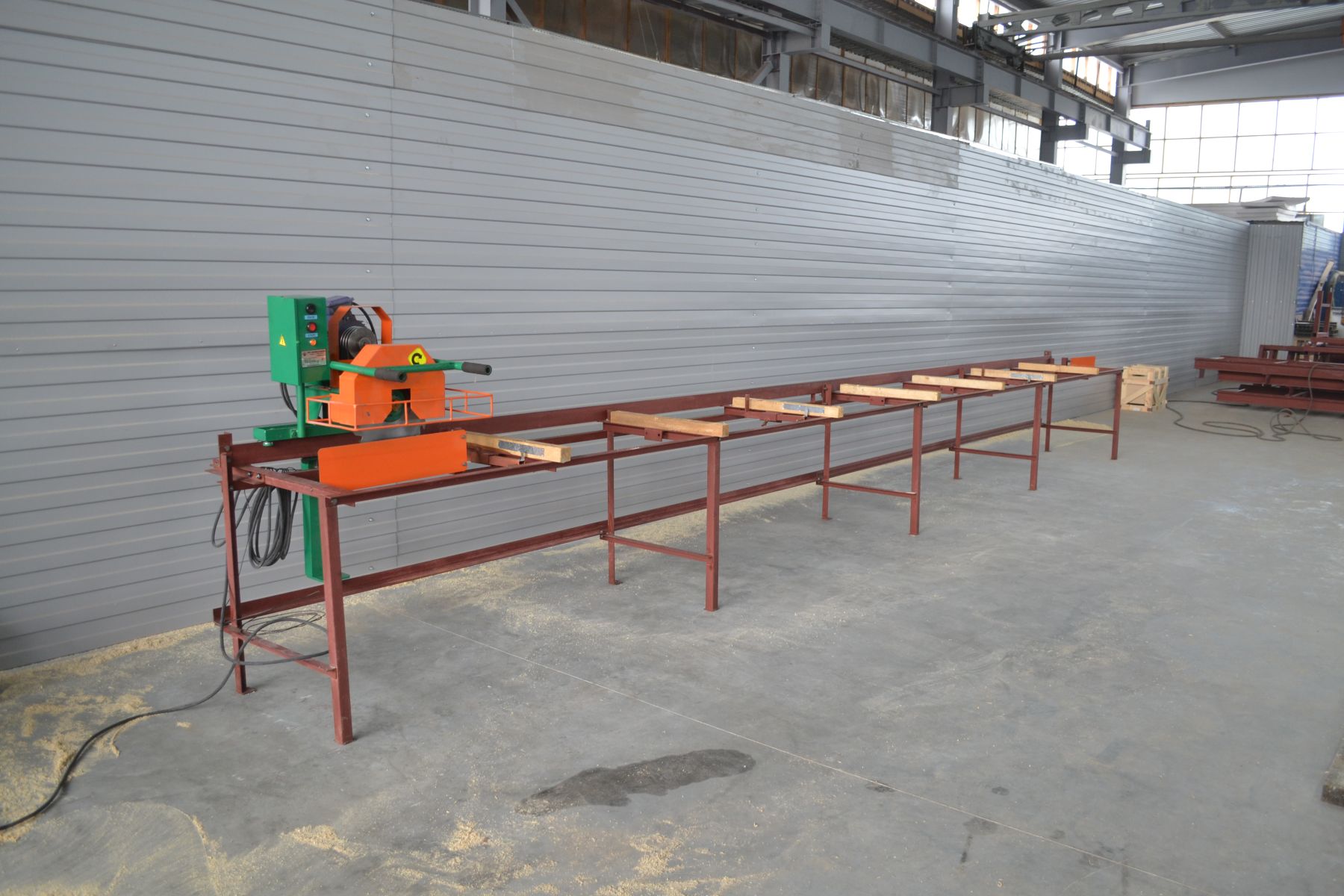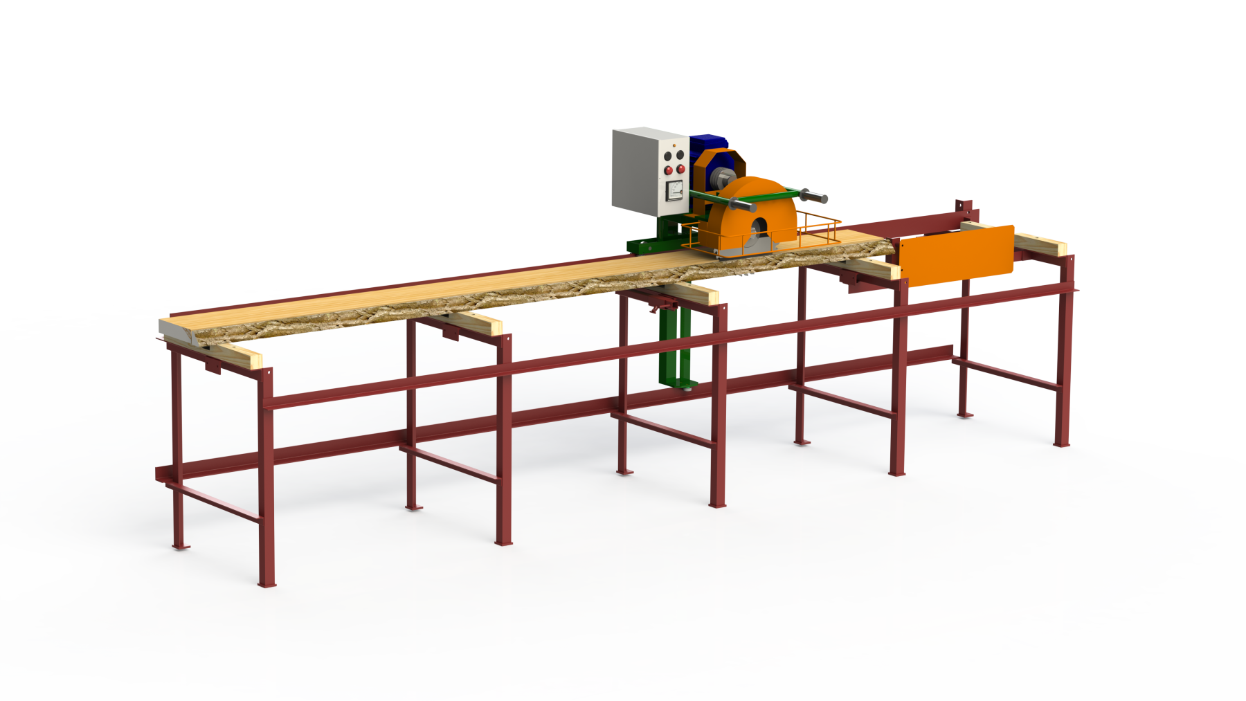 Исключительно жесткая и безопасная конструкция. В конструкции станков применены беззазорные направляющие, что обеспечивает идеальную точность пиломатериала. Первоначально обрезается обзол, далее заготовка базируется гранью по упорам, имеющим диапазон регулировки 5...250мм. Станок оптимален для производства бруска, заготовки под погонаж, индивидуального безотходного раскроя доски. Перемещение пильного блока осуществляется вручную оператором станка за поручни. Для удобства транспортировки рама станка разбирается на несколько составляющих.