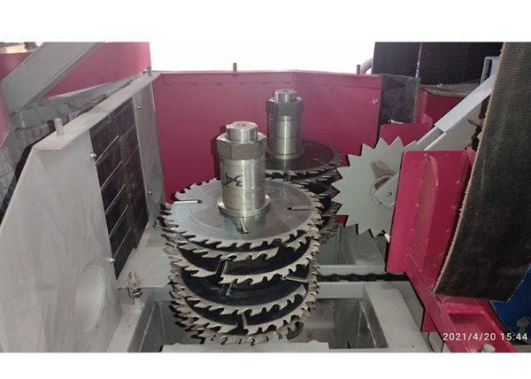 Многопильный блок двухвальный с вертикальным расположением валов. На каждом валу может быть установлено 6-9 пильных дисков в зависимости от толщины лафета. На выходе из блока установлен расклинивающий нож, который отделяет горбыль и обеспечивает принудительную подачу распиленного материала через блок приводных рябух на приемный стол станка В многопильном блоке установлены два электродвигателя мощностью по 30 кВт каждый и пилы диаметром 250 мм, что позволяет распиливать лафет толщиной до 160 мм.