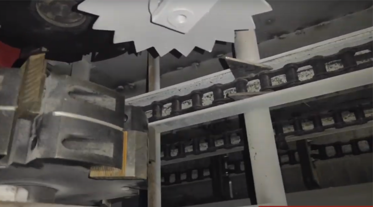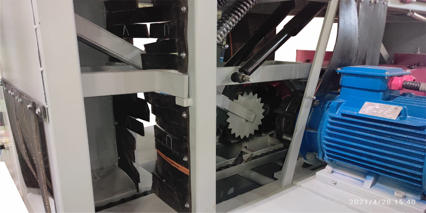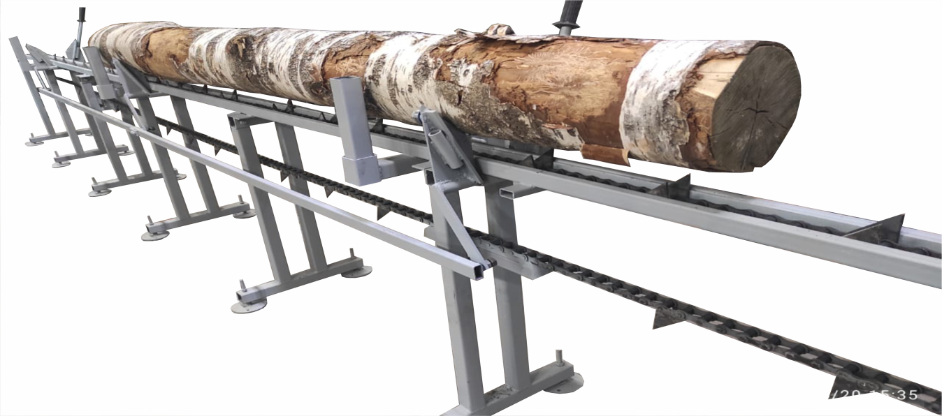 Транспортер скребковый цепной, предназначенный для автоматического удаления стружки, щепок и опилок из-под станины фрезерно-брусующего блока и пильного узла. Наличие скребкового транспортера в значительной мере повышает не только производительность станка, а также культуру и удобство. Конструктивно транспортер состоит из специальной транспортерной цепи, перемещающейся по направляющим за счёт мотор-редуктора, натяжение цепи осуществляется натяжным блоком с возможностью регулировки.